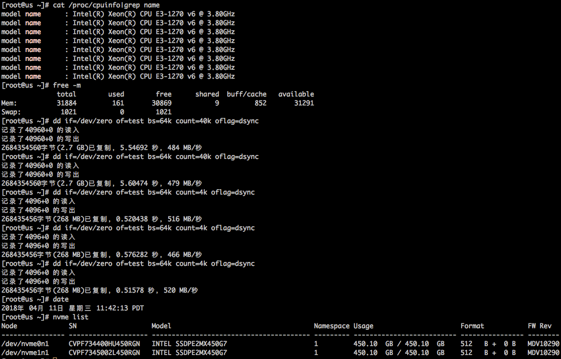 今晚趁有空记录下NVMe的SSD新服务器,什么都是新的CPU内存这些没啥亮点,所以主要看PCI-e的SSD硬盘dd速度。